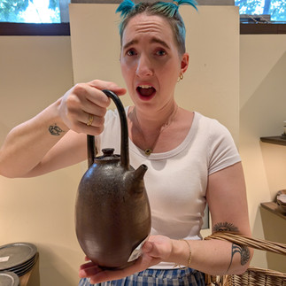 The highlight was finding a studio up the far end of the town, when we were feeling over hot and exhausted, who gave us a full tour of their making space, introduced us to their father and told us stories about how Bernard Leach visited once, 70+ years ago and how he was the talk of the town. Christian, his mum and his dad all showed us the three gas kilns they had, the mini noborigama kiln and the pottery wheels they'd been using for decades. There were pots made by Christian, the head potter now, from when he was a small child making alongside his dad. His dad had suffered a massive stroke and couldn't make the incredible large scale pots he used to anymore, but he was making teabowls while we spoke to him and was so charming as he told us stories of the pottery.